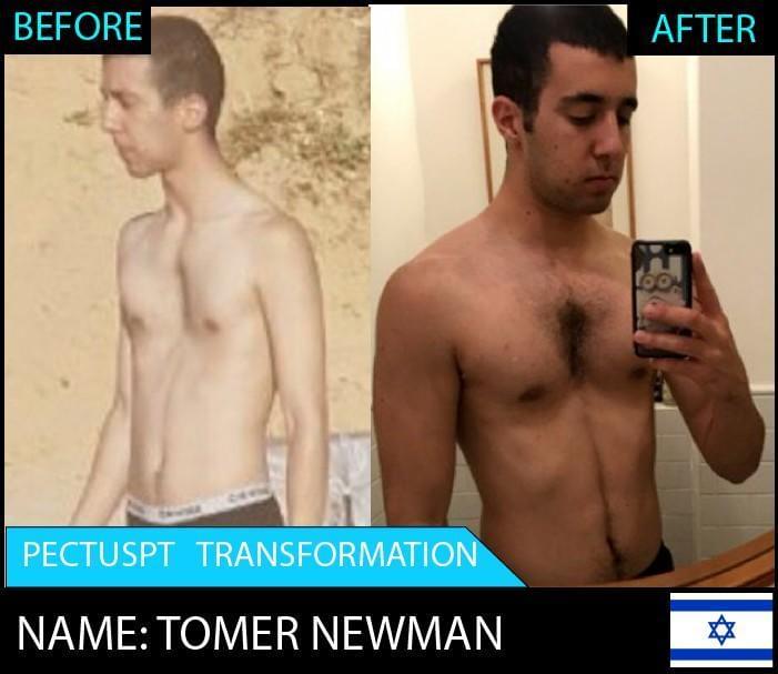 Tomer’s transformation highlights the power of building muscle & correcting posture to improve pectus excavatum. As you can see in his before photo his hunched posture & forward neck position accentuates the prominence of his indent. As soon as Adams posture was straightened his pectus became immediately less noticeable, this in conjunction with a lot more muscle provided an ultimate combination to enable him to completely transform his body.